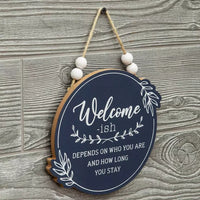 Furnish your cozy cottage with this Blue Welcome Floral Wood Wall Decor. This piece has a flat, round body that hangs from a beaded string and has a grayish-blue background. Its face features a narrow outline with greenery cutouts shaped on either side, and a comically welcoming message in the center. Break out complementary florals, beaded garlands, and decorate your entryway alongside this charming bit of wall decor.