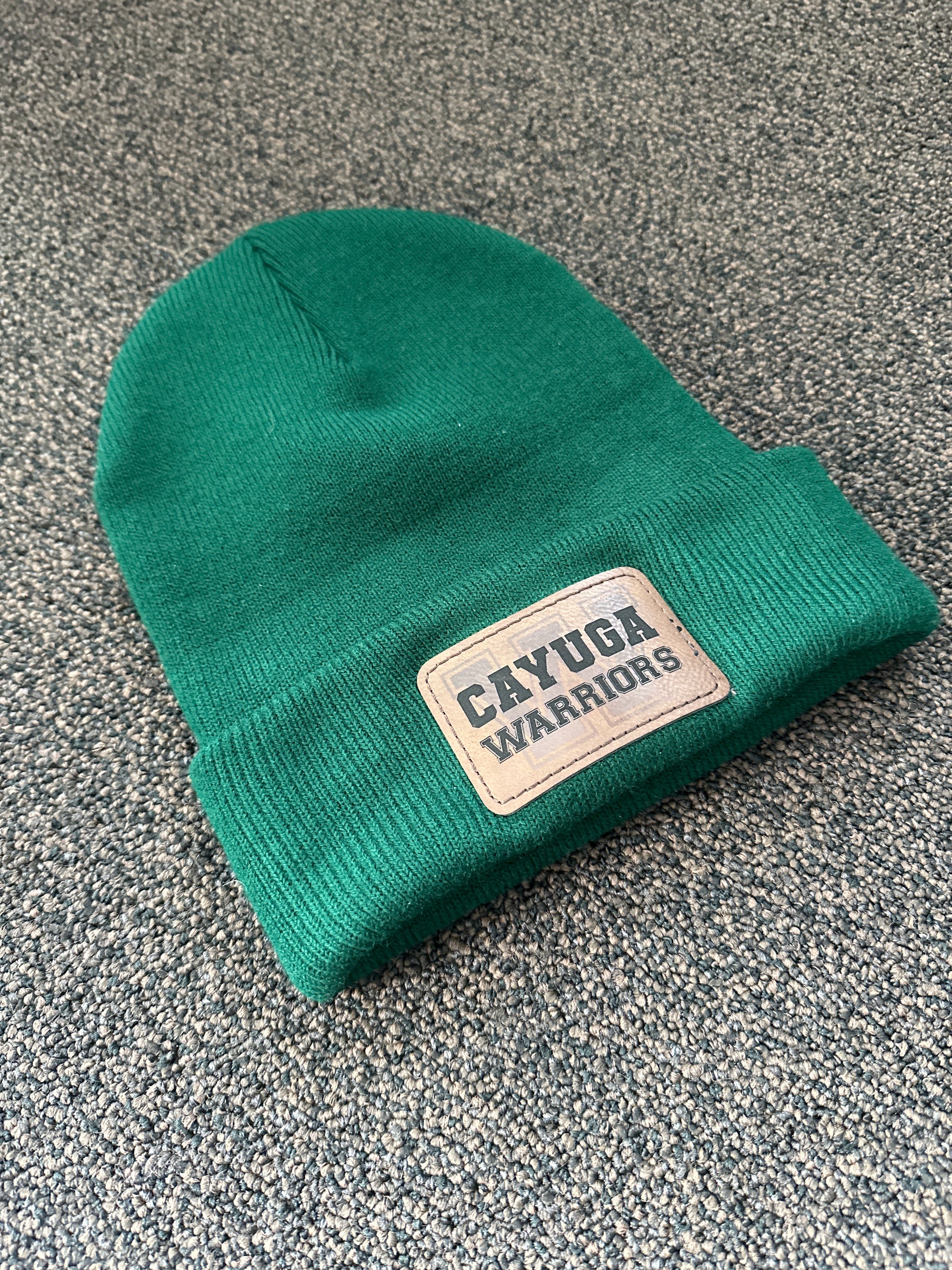 Custom Engraved Leather Patch on Touque