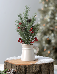 Bring a touch of cozy holiday charm to any space with this Evergreen & Berry Arrangement in White Pitcher. This compact décor piece features realistic-looking pine greenery accented with bright red berries and miniature pinecones, all artfully arranged in a classic white ceramic pitcher.