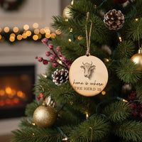 Celebrate country life and the love of your herd with this rustic “Home Is Where the Herd Is” wooden ornament. Featuring a beautifully detailed cow sketch and warm natural wood grain, this piece brings a cozy farmhouse touch to your home décor or Christmas tree.