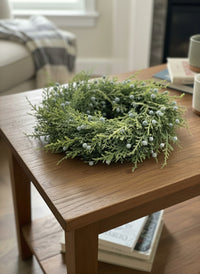 Bring a fresh woodland look into your winter décor with this lush juniper berry wreath. Featuring soft green branches accented with frosted blue berries, this piece adds natural texture and a subtle wintry pop of colour. Whether hung on a door or wall, or used flat as a centerpiece base, it creates an inviting seasonal touch anywhere in your home.
