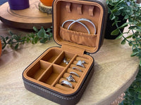 Engravable Leatherette Travel Jewelry boxes are compact for your suitcase or purse. The inside host's various compartments for chains, rings, earrings, or whatever jewelry you want to bring along. Personalize front, back, or both for Birthdays, Weddings, or Family Vacations, they make a perfect custom gift for any occasion. Great for bridesmaid gifts!