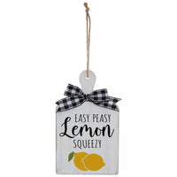 Elevate your kitchen with this Lemon Squeezy Cutting Board Wood Ornament! This piece is shaped like a small cutting board with a white body. The center features the phrase "Easy Peasy Lemon Squeezy" in black text with lemons underneath. Rounding out this decoration is a black and white checkered bow on the handle. Brighten up your space with this lovely ornament!