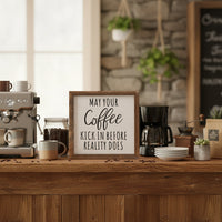 “May Your Coffee Kick In Before Reality Does” Wooden Sign – 6x6”