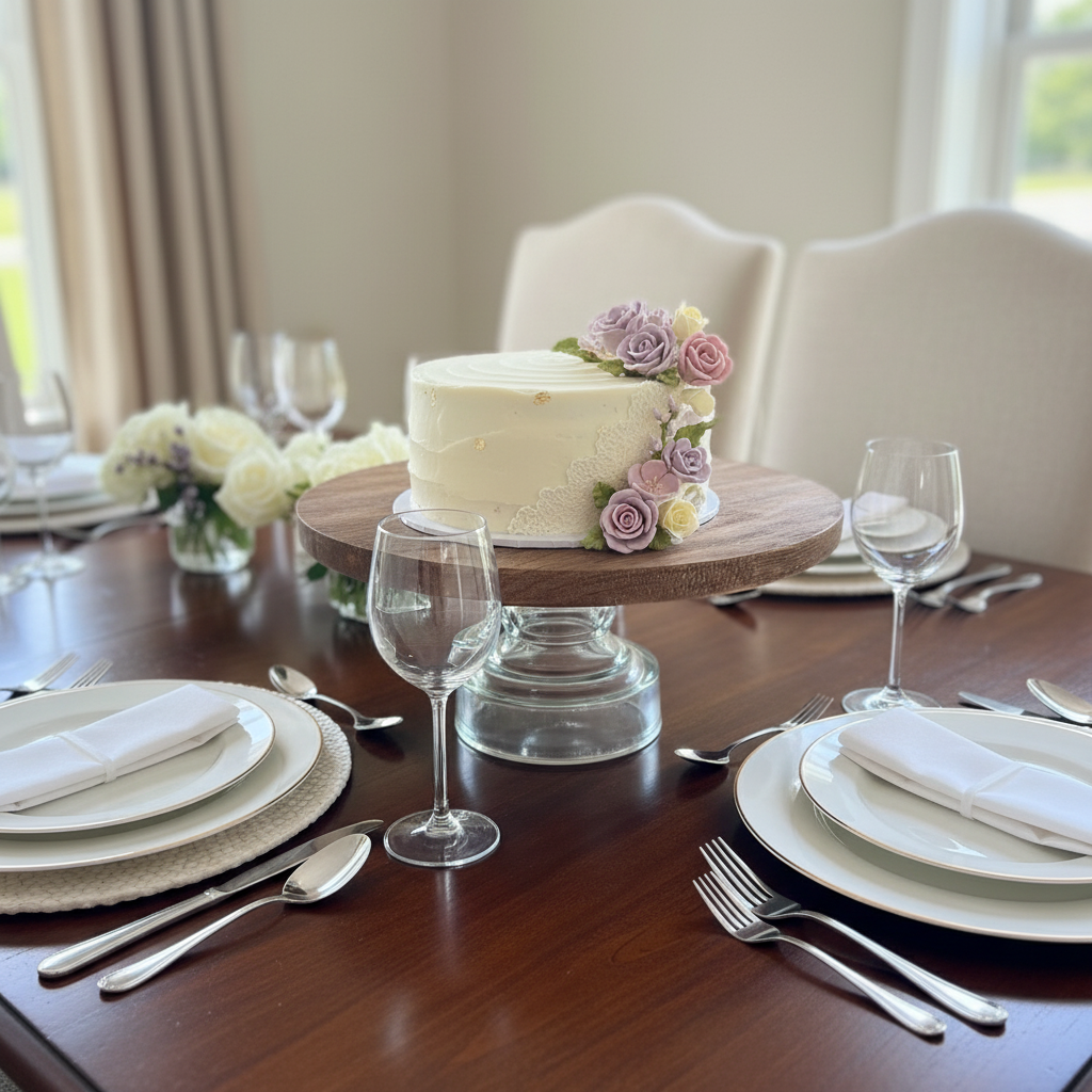 Display your favorite cake on our glass and wood cake stand. The cake stand features a glass pedestal that holds up the wood serving stand. This piece is a great addition to a farmhouse or farmstead kitchen theme.