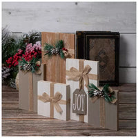 Add a touch of farmhouse Christmas charm to your home with this beautifully crafted wooden gift block set. Each piece is designed to resemble wrapped presents, featuring natural wood tones, burlap ribbon accents, and festive greenery with pinecones and berries. The neutral palette blends effortlessly with any holiday theme — cozy, rustic, or modern farmhouse.