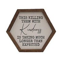 A little sarcastic, a lot relatable 😉 This bold hexagon sign features the phrase “This killing them with kindness is taking much longer than expected,” making it the perfect mix of humour and style. With its unique shape, rustic wood frame, and neutral background, it’s a fun statement piece that stands out in any room.