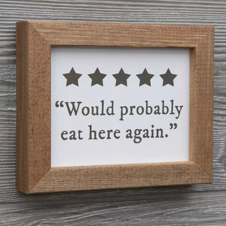 Add adorable accents to your space with this Would Probably Eat Here Again Wood Decor. Boasting a brown frame is a white insert with the words "Would Probably Eat Here Again." Above the words are five black stars. Display this cute decor in your kitchen or dining room.